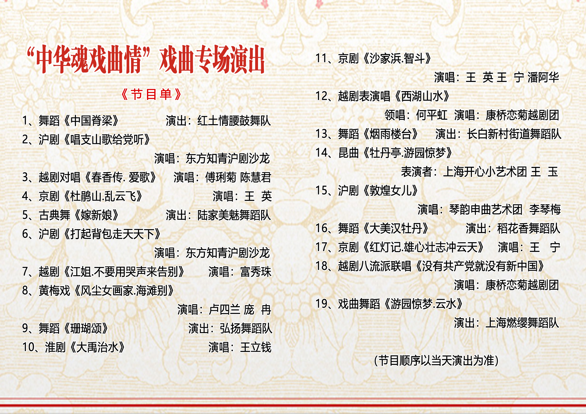 6月14日下午,由东方知青文化促进会主办、东方知青演艺联盟承办的“中华魂·戏曲情”戏曲专场演出在五里桥社区文化活动中心剧场精彩上演。本次演出汇聚沪剧、越剧、京剧、黄梅戏、淮剧等多种戏曲形式,结合舞蹈艺术,以经典剧目传递家国情怀,吸引数百名社区居民与戏曲爱好者到场观看。活动更获得上海市属农场知青联谊总会的大力支持,确保演出安全有序进行。