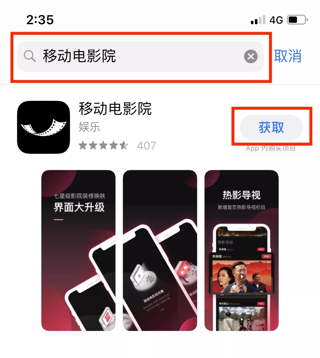 1 进入应用商店,搜索“移动电影院”,并下载 ![]()