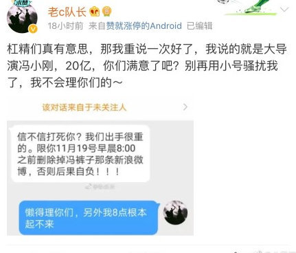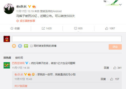 11月19日,认证为“北京银泰安投资顾问有限公司董事长”的微博网友“老c队长”发微博称:“冯裤子被罚20亿,近期公布。可以转发500次。”