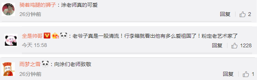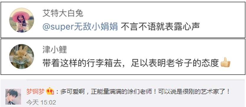 (来源:新浪微博) 于是,面对如此可爱的行李箱以及它的主人涂们老师,网友们开启了花式赞扬模式。 “这行李箱,牛”“让人不敢轻视的行李箱”↓ “涂们老师真的可爱”“粉定老艺术家了”↓