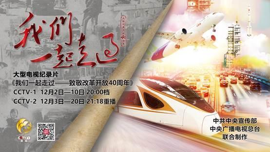 由中共中央宣传部、中央广播电视总台联合制作的《我们一起走过——致敬改革开放40周年》十八集大型电视纪录片12月2日起在央视综合频道20:00档每天播出两集,次日晚间21:18央视财经频道重播一集。