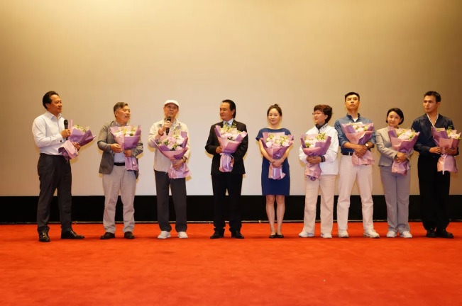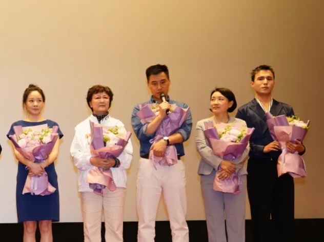 佟瑞欣向大家介绍了影片主创团队:导演严高山,来自上影演员剧团的演员达式常、王维维、赵静、林麟、孙清和来自新疆的演员努尔艾力·阿布拉、夏合亚尔·克力木。上海市徐汇区湖南街道为各位主创献上鲜花。 ![]()