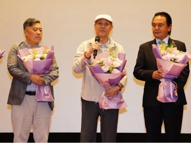 上影演员剧团表演艺术家达式常与导演严高山(左)、努尔艾力·阿布拉(右)