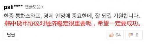 韩国网友心焦:“(协议)太重要,希望一定要成功” 正如李柱烈今天早上对媒体的表态:“协商还没有彻底结束,实际上今天双方还计划(就韩中货币互换协议)举行会议”,“请耐心等待最终达成协议的一刻”。 话虽如此,韩国媒体却难以按捺住焦虑情绪。 韩国与中国其实从今年6月开始就延长货币互换协议进行协商,并决定尽量从经济视角出发看待这一问题,仅将着眼点放在两国金融合作与贸易增进等经济目标之上。 据韩国《东亚日报》报道,目前两国政府的新一轮工作谈判已经大部分结束,只剩下两国领导人的最终决定。 报道披露说,韩国政府早前就确定了延长中韩换币的方针并进行了谈判,但是中国还没有正式和非正式地谈及是否延长。 ![]()