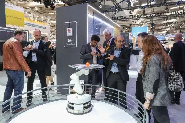 ▲4月24日,在德国汉诺威,参观者们观看华为公司展区展出的运用5G技术操控的机器人。(新华社)