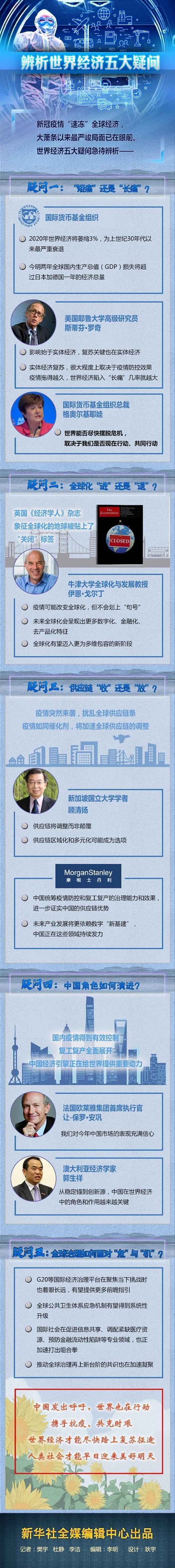 IMF预测,如果全球多数国家疫情在今年二季度达到峰值、下半年消退,世界经济有望在2021年反弹;如果缺乏应对疫情的全球行动,衰退会更深更久。 V型、U型还是L型?世界经济要走出“好看”的复苏曲线,亟需各国在防疫情、保民生、稳经济上应对得力、合作并进。IMF总裁格奥尔基耶娃疾呼:“世界能否尽快摆脱危机,取决于我们是否现在行动、共同行动。” 迎接公共卫生挑战,妥善安排复工复产,缓解资金压力,提振市场信心,防范债务风险……各国和国际社会推出了力度空前的举措,只待效果。 “退”与“进”:全球化走向何方 英国《经济学人》杂志不久前一期封面上,象征全球化的地球被贴上了“关闭”的标签。 但在牛津大学全球化与发展教授伊恩·戈尔丁看来,疫情可能成为改变全球化的“一个因素”,但不会给全球化画上“句号”。 疫情大暴发是对全球化的最新考验。各国同陷危机,经济同步滑坡,作为全球化核心的国际生产和贸易严重受损。人们担心,未来“脱钩”倾向加剧,全球化有逆转之虞。 疫情确实使一些国家短期内封境自保,但长期看全球分工和资源配置的好处明显,全球化的强大逻辑不会轻易因为这场疫情改写。退回孤岛不现实也不明智。 更何况,全球危机需要全球应对。从病患救治,到药物和疫苗研发,再到国际联防联控所需的信息共享和物资调度……团结合作、全球行动才是击退疫魔的最有力武器。 跨国公司联手打造针对新冠病毒的蓝牙预警系统;医疗设备生产企业共享可提高疗效的数据;在商品和人员流动卡顿之时,信息数据高速流转,跨境金融迅猛发展,疫情中全球化新势力正在加速成长。 戈尔丁认为,未来全球化会呈现出更多数字化、金融化、去产品化特征。经历疫情考验,全球化有望迈入更为多维包容的新阶段。 “收”或“放”:供应链如何调整 苹果公司正在考虑将其首款5G智能手机推迟发布;宝马和大众等汽车制造商纷纷调整生产计划,关闭多座位于欧洲的工厂。 ![]()