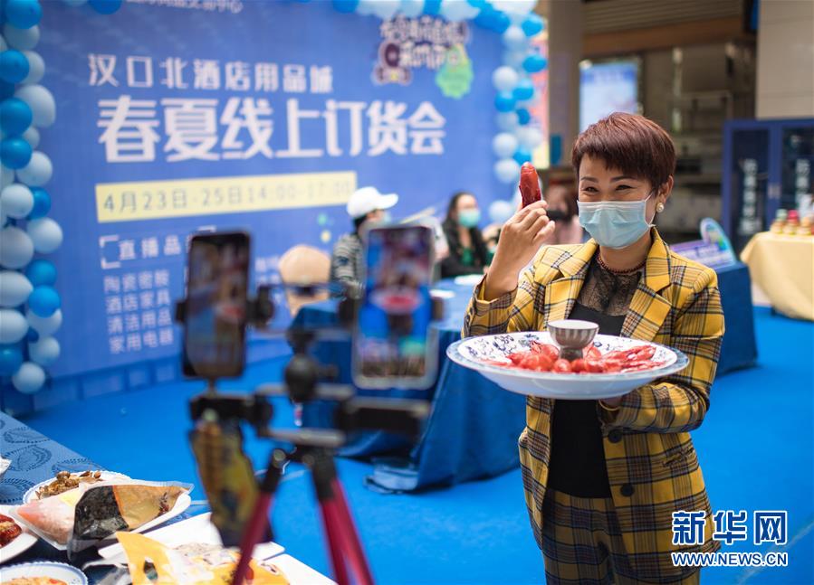 4月23日,湖北武汉汉口北市场内商户在直播销售自家的餐盘。新华社记者 肖艺九 摄