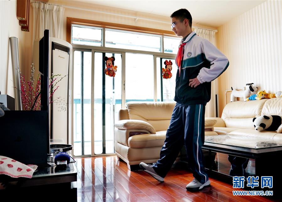 3月2日,上海市三门中学初二学生孙旭涵跟随在线教育体育课老师学习居家健身操。新华社记者 刘颖 摄