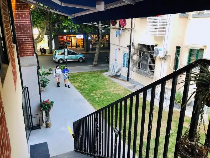 愚巷商户“钱店”与“element”之间共享的楼梯。拾级而下,梧桐掩映之下就是愚园路