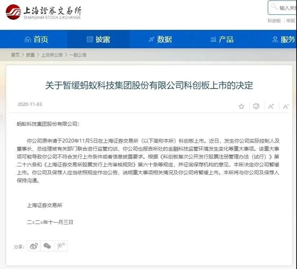 大部分突发消息,其实早已注定。 先看蚂蚁集团的招股说明书。 ![]() 投行兄弟在写这份风险提示时,大概万万没有想到会这么快“灵验”。里面有这样一句话:“面对新的法规和监管环境,公司不能保证始终能对业务做出及时调整以应对合规要求。为此,公司可能会增加成本,预期业务增长也可能受到影响。” 你品,你细品,有没有一种对市场的傲慢?不知道狂热打新蚂蚁的股民们,如果认真看到这里,会不会后脊背发凉? 根据墨菲定律,越觉得不可能发生的事情,往往真实发生。就在蚂蚁集团等候上市之前,新的法规和监管环境呼啸而来。 11月2日,银保监会和央行共同发布《网络小额贷款业务管理暂行办法(征求意见稿)》,里面有一条直接关系到蚂蚁集团主营业务:在单笔联合贷款中,经营网络小额贷款业务的小额贷款公司出资比例不得低于30%。意见稿还对网络小贷公司的融资杠杆上限划定红线。 过去蚂蚁集团将自己往科技公司撮堆,存在监管套利。但是,随着监管对金融科技认识的深化,监管的篱笆在扎紧。金融科技本质上是一种技术驱动的金融创新活动。无论叫金融科技还是科技金融,始终不能忘记金融属性,不能违背金融运行的基本规律。因此,监管上金融科技公司的管理属性发生重大变化,从事金融业务就应当按照业务属性纳入金融监管范畴,没有法外之地。 这会不会影响蚂蚁赚钱的速度和利润率? 如此重大的变化会不会影响蚂蚁集团股票估值? 那么在上市之前,是否应该叫停? 如果按上市前的定价,蚂蚁集团市值将达到3130亿美元。但是一旦上市之后,公司的财务模型、商业模式却需要重新拟定。 11月3日晚,上交所发布关于暂缓蚂蚁科技集团股份有限公司科创板上市的决定。 ![]() 暂缓上市,原因很清楚:该重大事项可能导致公司不符合发行上市条件或者信息披露要求。 法律依据也很清楚:根据《科创板首次公开发行股票注册管理办法(试行)》第二十六条和《上海证券交易所股票发行上市审核规则》第六十条等规定,并征询保荐机构的意见,本所决定你公司暂缓上市。 那么,具体条文是怎么说的呢? 一是,股票发行上市交易前,发生重大事项的,发行人及其保荐人应当及时向交易所报告,并按要求更新发行上市申请文件;发行人的保荐人、证券服务机构应当持续履行尽职调查职责,并向交易所提交专项核查意见。 二是,上市委审议后至股票上市交易前,发生重大事项,对发行人是否符合发行条件、上市条件或者信息披露要求产生重大影响的,交易所的发行上市审核机构经重新审核后决定是否重新提交上市委审议;重新提交上市委审议的,应当向证监会报告。 三是,证监会作出注册决定后至股票上市交易前,发生重大事项,可能导致发行人不符合发行条件、上市条件或者信息披露要求的,发行人应当暂停发行;已经发行的,暂缓上市;交易所发现发行人存在上述情形的,有权要求发行人暂缓上市。 此外,网上公布的蚂蚁集团上市注册批复中也已明确,在同意注册之日起至本次股票发行结束前,如发行人发生重大事项,应及时报告交易所并按有关规定处理。 ![]() 法律专家表示,上交所作出暂缓决定于法有据。《科创板IPO办法》与《科创板上市规则》早已公布,具有正当性、稳定性、公平性、可预期性。在蚂蚁集团处理好上市之前的重大事项前,上交所需要履行自律监管职责,为公众投资者站好岗、放好哨、把好关。 当出现重大事项后,如果没有相关解释、相关处理、制定相关预案,且一旦商业模式需要调整,那企业估值可能发生重大变化,股价可能出现较大波动。这不仅会直接影响投资者利益,对企业的持续发展也会造成冲击。 因此,为了更好维护金融消费者权益,维护投资者利益,维护资本市场的长期健康发展,暂缓上市。另一方面,也是考虑到企业上市之后的持续健康发展。仓促上市,不如将重大事项解决好之后稳妥上市,这样对企业发展更加有利。提前将监管风险、市场风险彻底消化,这样反而有助于提升公司透明度、公信力。同时,也会提升投资者信心,形成投资者友好型上市公司。 正是从这个意义上,蚂蚁集团暂缓上市对广大企业都有启示。正如一位网友所说: ![]() (金观平) 责任编辑:日升 (责任编辑:日升) |