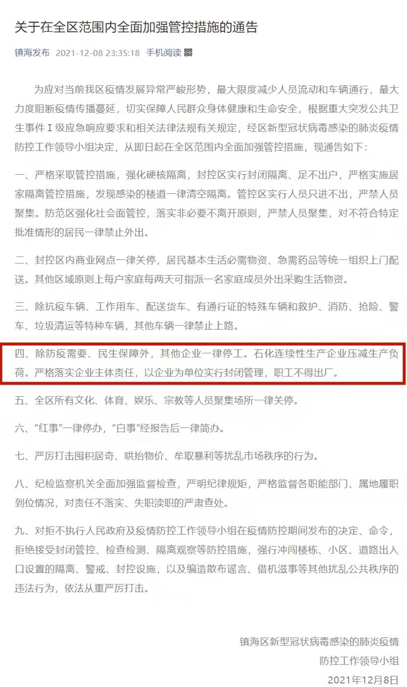 ![]() 管控升级,企业一律停工 据浙江卫健委数据,12月13日0-24时, 新增确诊病例45例,其中杭州市2例、宁波市4例、绍兴市38例、境外输入1例(刚果金输入),截止13日24时,累计报告确诊病例1721例(境外输入病例284例)。在严峻的态势下,为遏制疫情扩散和蔓延,浙江多地管控措施升级。 目前,全省除绍兴东站、上虞火车站实行只进不出管控措施外,其他站均运行正常。杭州萧山区、宁波镇海区、绍兴上虞区人员严格限制通过铁路出省,杭州、宁波、绍兴等3个地市其他县(市、区)的人员出省必须持有48小时内核酸检测阴性证明。以上中高风险涉疫地区出行要求执行时间将一直延续到2022年3月15日。 ![]() 宁波镇海决定在全区范围内全面升级管控措施,除防疫需要、民生保障外,其他企业一律停工,石化连续性生产企业压减生产负荷。严格落实企业主体责任,以企业为单位实行封闭管理,职工不得出厂。 浙江绍兴: 绍兴上虞启动I级应急响应,多个区域临时实施封闭管理。除防疫需要和民生保障以外,区域内其他各类企业暂时停工。另据部分企业表示,全区所有工业企业一律实施停产防疫,非化企业12月9日14时起立即严格执行停产防疫措施,化工企业12月9日14时起严格执行停止投料,启动执行安全停产方案,有检维修等作业的一并执行停止作业。 浙江杭州: 经市疫情防控工作领导小组研究决定,对杭州市部分区域公共场所和公共活动采取限制性措施。上城、拱墅、西湖、滨江、萧山、余杭、临平、钱塘8个城区,关停棋牌室、酒吧、KTV、麻将房、桌游室、游泳馆等室内密闭公共场所等。 多个地区紧急叫停全区所有工业企业,对于石化、危化对企业的开工做出限制,随后浙江龙盛、皇马科技、贝斯美等十几家上市公司发布临时停产公告,并预计将给企业的经营业绩带来不利影响。 药石科技:公司控股子公司浙江晖石药业有限公司按要求已于12月9日下午开始逐渐减量及有序临时停产,具体恢复正常生产经营时间将根据政府疫情管控要求作出安排。预计本次逐渐减量及有序临时停产将延迟浙江晖石产品的生产和交付,将对浙江晖石经营业绩产生一定的不利影响。 浙江龙盛:受疫情影响,公司位于浙江省杭州湾上虞经济技术开发区的所有子公司已开始逐渐减量及有序临时停产。上述子公司主要目前主要生产染料、化工中间体、减水剂等化工产品,预计此次临时停产将延迟公司相关产品的生产和交付,会对公司本月经营业绩产生不利影响。 皇马科技:公司下属全资子公司浙江绿科安化学有限公司、浙江皇马尚宜新材料有限公司于12月9日下午起开始逐渐减量及有序临时停产。预计本次逐渐减量及有序临时停产将延迟公司产品的生产和交付,预计会对公司本月经营业绩产生不利影响。 贝斯美:决定于2021年12月10日起临时停产。本次停产预计将对公司2021年第四季度经营业绩产生一定的不利影响。 中欣氟材:于2021年12月10日开始逐渐减量及有序临时停产,具体恢复正常生产经营时间将根据当地政府要求作出安排。 扬帆新材:于12月10日开始有序停产,复产时间待有关部门根据疫情防控情况决定,上虞基地主要生产部分光引发剂产品。临时停产对公司2021年总体业绩影响相对有限。 争光股份:全资子公司宁波争光树脂有限公司于2021年12月10日起临时停产,具体恢复正常生产经营时间将根据当地政府疫情管控要求作出安排。 宁波浙铁大风化工:根据要求,装置不得不临时停车,物流运输停滞,产品处于无法出货状态,已签订的订单现无法交付。 国邦医药:公司上虞基地子公司接到有序停产的通知,已停止投料有序安全停产,目前正在评估影响并采取相关措施。 新和成:绍兴上虞基地接到12月10日开始有序停产通知,公司还在评估影响并作出安排。 除此之外,江苏宇星颜料、江苏三木集团、华祥(中国)高纤有限公司、荣盛集团等当地企业均提示客户,由于当地疫情封闭,来提货或送货的运输人员,须持有24/48小时内核酸检测阴性报告,并注意选择特定高速口进出,健康码为红码、黄码的司机及外来人员一律不准进入。 生产受限、运输受阻 据公开资料,浙江防控升级的三个地区多为塑料化工集中区域,汇集纺织原料生产、下游聚酯消费、包括芳烃产业、聚烯烃产业、还有危化品生产等。从地区管控要求来看,多数提出了对石化生产企业采取停车、停产、降负的要求,对部分化工品的影响较大。 镇海地区是国内重要的石化基地,已落户宁波石化经济技术开发区的国内外著名企业包括:荷兰阿克苏诺贝尔、韩国LG甬兴、日本大赛璐化学和镇洋化工、中金石化、浙江新材料、宁波富德、巨化科技、杭州湾腈纶等。 责任编辑 晓歌 (责任编辑:晓歌) |