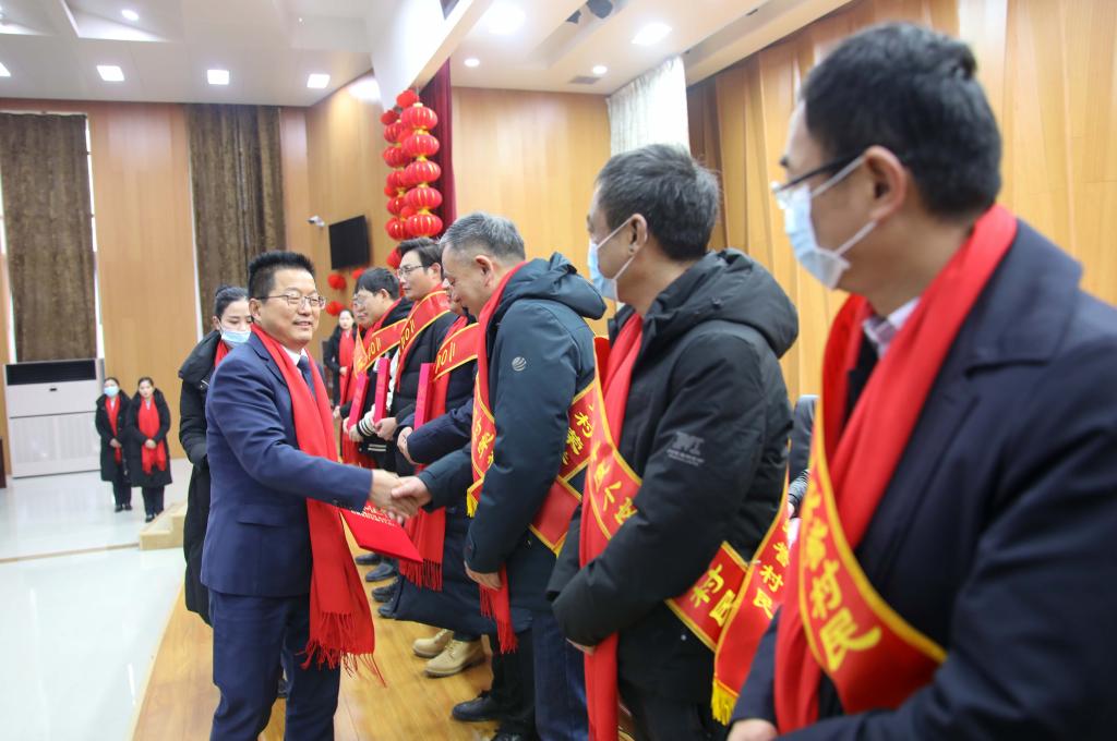 在小岗村分红现场,凤阳县委常委、小岗村党委第一书记李锦柱向荣誉村民颁发荣誉证书。新华社记者曹力摄