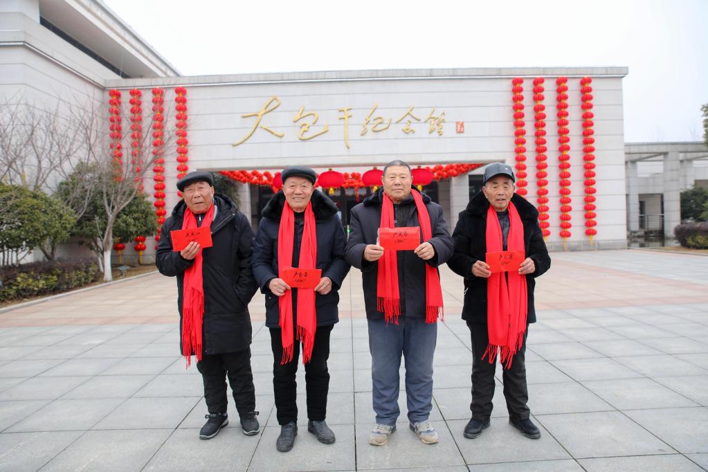 在凤阳县小岗村,几位“大包干”带头人展示领取的分红红包。新华社记者曹力摄