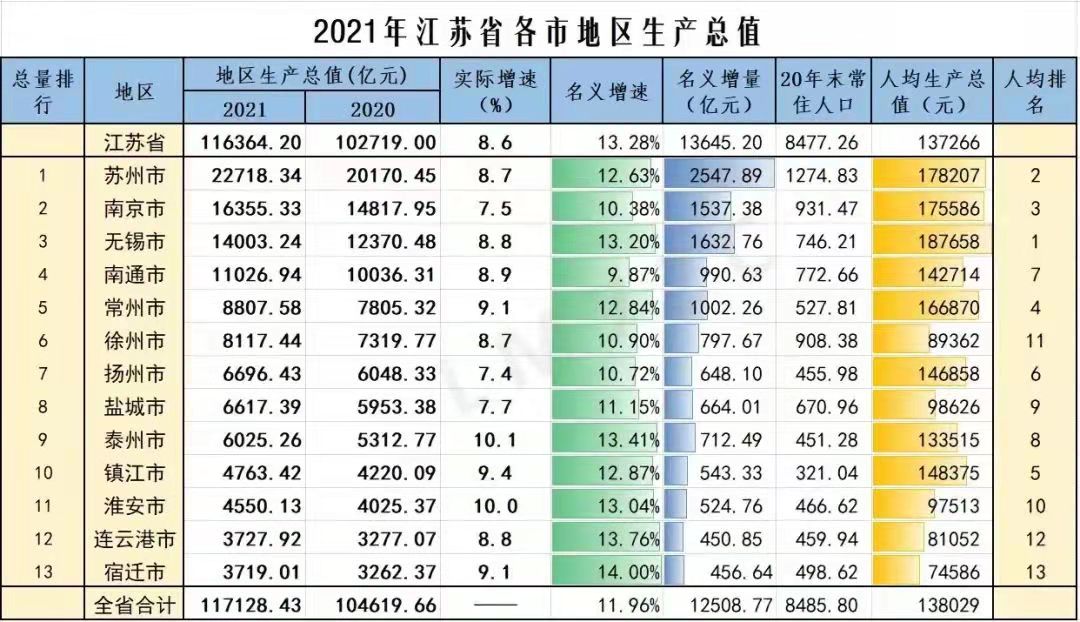 ![]() 按照无锡此前公布的数据,2021年无锡GDP达1.4万亿元,也就是说,江苏在过去的一年中,足足净增了一个无锡! 这是什么水平?作为苏南模式的代表之一,无锡可不是吃素的,按照现在流行的算法,1无锡≈1黑龙江省≈4.3青海省。 按照2021年6.45的平均汇率换算,江苏的GDP高达1.8万亿美元,超过澳大利亚、俄罗斯、韩国,略低于全球排名第8的意大利。 这也意味着,2021年,江苏的经济体量首次全面超越“亚洲四小龙”,江苏的实力,已经成为全球都不能低估的存在。 苏州一如既往的表现炸裂,GDP达到2.27万亿,占江苏全省五分之一。 一年时间净增2500亿元的体量,其增长水平甚至超越了同体量时期的上海、深圳、广州、重庆,仅落后于北京。 苏州的规上工业产值,更是踏上4万亿新台阶,稳居中国工业第一城。除此之外,作为外向型制造业城市的典范,苏州进出口总额更是达到了恐怖的3800 亿美元,占江苏全省的一半。 南京自从江苏实施强省会战略后,依托自身深厚的基础,经济表现可以用“突飞猛进”来形容,2020年总量挤下天津,跻身全国十强,2021年完成GDP1.63万亿,增量达1500亿元。 再加上南京深厚高校资源作为后盾:南京有8所211大学,2所985大学,高教资源在全国仅次于北京和上海,南京几乎不可能失速。 无锡这两年虽然少有突出表现,但依靠高度发达的民营经济,比如海澜集团、江苏扬子江船业、红豆集团等,经济也稳的一批,2021年完成GDP1.4万亿,增量达1600亿元,增速为近10年最快。 无锡还是中国第二个集成电路产业超千亿级产值的城市,物联网产业营收约占全国的1/4。 新晋小霸王南通表现同样炸裂,经济总量5年连跨5个千亿级台阶。2020年,南通成为江苏第4个GDP过万亿的城市,也是长江以北第一个迈过万亿门槛的地级市。 2021年,南通拿下1.1万亿的GDP总量,增量近千亿,南通本地的一些自媒体,甚至已经迫不及待的喊出5年超无锡的愿景。 万亿城市说完了。 但你以为这就完了?大哥们表现亮眼,小弟也不甘示弱。 没人拖后腿 江苏最可怕的还不是富,而是均富,全省多点开花,百花怒放。 整个江苏省,GDP过两万亿的城市一座,过一万亿的城市三座,6000-8000亿GDP的城市五座,4000亿的四座,江苏13个地级市全部是全国百强城市。 常州、徐州登上8000亿元新台阶,扬州、泰州和盐城在6000亿元档。 尽管两万亿的苏州和万亿的南京、无锡、南通表现炸裂,但那些“五千亿”级的小伙伴,才更能代表江苏。 过去10年,宿迁、徐州、淮安、连云港、盐城、南通,构成了江苏增长最迅猛的“苏北板块”,宿迁这个寂寂无名的地级市更是一举夺得增长增长冠军的头衔。 镇江和淮安虽然都还在4000亿的关卡,但增速领跑全省,镇江更是有望今年走上5000亿的新台阶。 2021年,宿迁市GDP总量(3720亿元)不仅高于甘肃省会兰州市,也超过整个青海省,以一市抵一省,排面无人能及。 往未来看,常州、徐州破万亿也就一两年的事情、扬州、盐城、泰州都有望在未来十年内进入万亿GDP,南京、无锡、南通则是奔着1.5万亿的级别去的。 未来,江苏有可能有八座城市过万亿GDP。 江苏之所以强大,是因为制造业,世界制造看中国,中国制造看江苏。 从2013年到现在,江苏省连续9年保持制造业规模全国第一,远超后面的广东、山东、浙江等省份。 2021年,江苏占了全中国13%的制造业产值。 到今天,江苏共有大大小小超过54万家工业企业,形成了中国规模最大的工业集群,是中国34个省级行政区里无可争辩的“制造业霸主”。 疫情冲击下,正是完备的制造业体系帮助这些城市“扛住”了压力,支撑了经济的持续增长。 到今天,江苏各个城市基本上都已经经营好了自己的“基本盘”,有了属于自己的支柱产业。 就不去赘言南京和苏锡常通了,说说苏中苏北。 徐州能制造一流的矿山机械和工程设备,连云港有中国最大的抗肿瘤药物研究和生产基地,盐城强于化工和汽车,扬州擅长石化工业,泰州则是“中国第一造船大市”,泰州的船厂接了全球七分之一的造船订单。 小弟们都这么强,更别说大哥们了。 说的再直接点,制造业对财政税收的贡献虽然没有房地产那样一次性来的那么猛烈,但当制造业达到极大的规模后,能带来巨大的稳定的税收。 江苏的人口只占全国的6%,面积只有全国的1%,但对国家财政的贡献率却常年维持在10%左右,绝对称得上是共和国的“钱袋子”。 走向共同富裕 2021年,江苏还创造了新的一个记录,成为地球上第4个人均GDP超2万美元的8000万人口以上的经济体。 前三个是美国(6.5万美元)、德国(5万美元)、日本(4万美元)。 只要按现在的增速再发展8年,江苏的人均GDP将超过日本。 再从省内差距看,江苏的人均GDP省内差距在近二十年来已经大幅收窄。 最高的无锡和最低的宿迁之间,差距已从2010年的4.2倍,收窄到2.5倍。 可以看到苏南、苏中、苏北三大板块之间的差距已经逐步得以弥合,正在走向共同富裕。 如果江苏各地保持现有的增速不变,到2030年,省内的差距有望进一步缩小到1.8倍以内,届时这一差距之小,将达到发达国家的水准。 要知道,全世界差距最小的日本也有1.6倍。 再来看粤老大,虽然33年来一直稳稳地占据着经济榜单的首位。 虽然深圳、广州、佛山独占鳌头,但无奈小弟们实在不给力,GDP不足2000亿的城市比比皆是,增量微不足道,在10万亿级别的体量面前,甚至可以忽略不计。 从数据上看,未来,全面发展的江苏,潜力比广东要大,江苏
