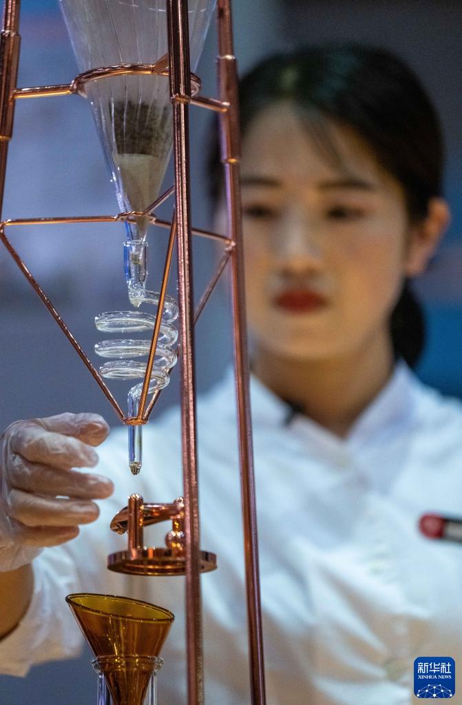云南勐海大益茶庭的茶艺师陈夷在制作冰滴普洱茶(5月10日摄)。新华社记者江文耀摄