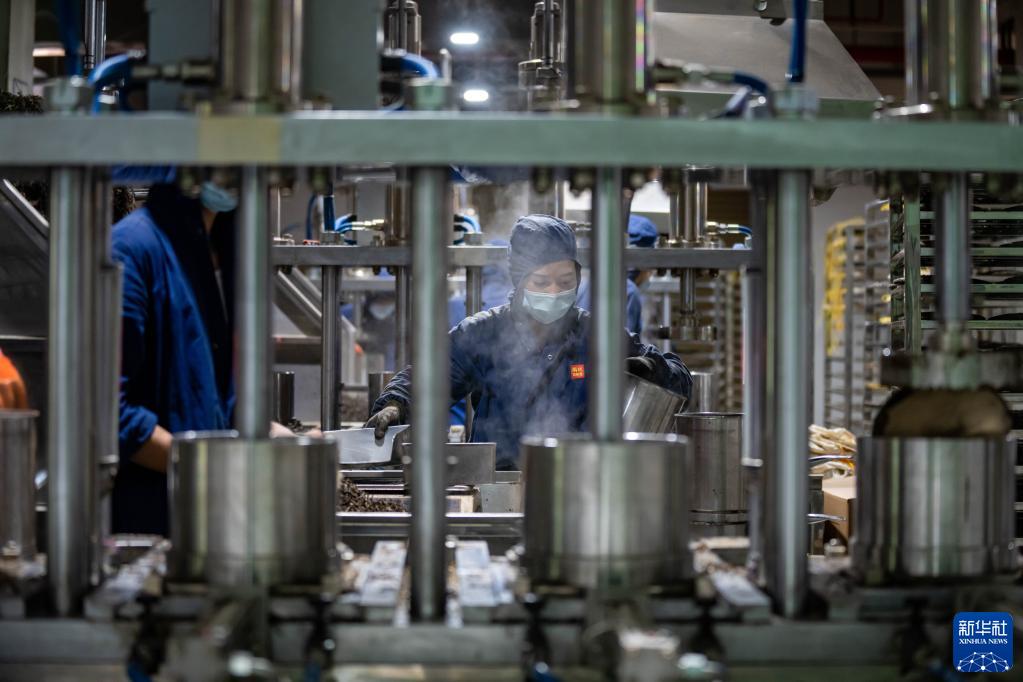 工人在西双版纳傣族自治州勐海县雨林古茶坊茶叶有限责任公司的生产线上制作普洱茶(5月10日摄)。新华社记者江文耀摄