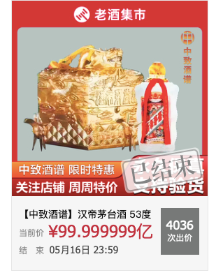 随后,由于涉嫌恶意竞拍,阿里拍卖中止该场拍卖,改为5月17日重新上拍。二次开拍后,虽然围观者众,却无一人出价,最终导致流拍。 “汉帝茅台”被拍至近百亿元 平台紧急叫停 自带流量的茅台酒本就颇受关注,更何况是具有“唯一性”的稀缺品。 据阿里拍卖平台介绍,“汉帝茅台酒”产于1992年,规格为53度500ml,当年仅产了10瓶,其中9瓶已在香港拍出,目前仅一瓶留存。 “汉帝茅台”起拍价定为3999万元,保证金2000元,加价幅度100元,而且关注商家店铺,还可免缴保证金。这意味着可以零成本参拍。 开拍后,迅速引发激烈的“价格战”,共1769人报名,12.87万次围观,短短时间超过4000轮竞价,价格直接飙至99.9999亿元,差100块就到100亿元! 因此,5月16日晚,阿里拍卖紧急叫停该场竞拍,并在官方微博上表示:竞价过程中有用户涉嫌恶意竞拍,导致竞拍价格已远超估值,暂时中止本场拍卖,并于5月17日重新上拍。 保证金大增 二次拍卖流拍 二次开拍后,“汉帝茅台”的起拍价依然是3999万元,但将参拍保证金提高到5万元,并取消了“免缴保证金”,拍卖时间由5月17日下午2时至5月20日23时59分59秒。 本轮共6人报名,共12.78万人次围观,但截至拍卖结束却无一人出价,最终流拍。 公开资料显示,“汉帝茅台酒”是贵州茅台酒股份有限公司生产的一个奢侈酒品种,其包装外盒材质为精铜无缝铸造并镀金,盒底刻有“汉帝茅台酒”篆体字样的印章,盒盖顶部镌刻蛟龙,龙口含一颗纯金宝珠。 据媒体报道,20世纪90年代末期,“汉帝茅台酒”最高曾拍出100万港元的高价。 2011年4月,在由贵州省拍卖公司举办的“首届陈年茅台酒专场拍卖会”上,一瓶“精装汉帝茅台酒”起拍价290万元,最终被“中国茅台酒收藏第一人”赵晨以890万元拍下,刷新了茅台酒拍卖成交价格的历史纪录。 2012年6月,在北京保利2012春季拍卖会的中国白酒专场,一瓶977克、53度500ml的“汉帝茅台酒”拍出897万元。 2014年8月16日,在河南一场秋季艺术品拍卖会上,一瓶“汉帝茅台酒”最终以920万元的价格成交。 2019年天津糖酒会上,“汉帝茅台酒”标价高达3100万元;如今,更是开出3990万元的起拍价。近30年时间里,“汉帝茅台酒”的拍卖价格上涨了45倍。 业内人士:存在炒作成分 有业内人士表示,像“汉帝茅台”等稀缺型老酒,由于其不可再生性,数量只会越来越少,早已成为金融属性产品或收藏品。 根据中国酒业协会此前发布的《中国老酒市场指数》报告,2013年至2018年,老酒市场规模持续扩大,2017年的市场规模达到370亿元,2018年达到500亿元。随着老酒价格不断上升、消费者人群持续增加,业内预计2021年老酒市场规模超过千亿元。 同时,也有不少行业人士表示,此次拍卖存在炒作成分。 “4000万元起拍的酒,怎么能是0门槛参与,甚至连保证金都不用交,商家或平台难道没有考虑到存在失控隐患吗?抬高门槛后,反而一个出价的都没有,商家和平台倒是赚足了眼球。”某白酒行业从业者告诉记者。 酒水行业研究者欧阳千里表示,拍卖本身即是传播,即使略高于起拍价成交,都锚定了飞天茅台的收藏价格,会提振老酒收藏的信心;平台需要让更多的人了解,“拍卖的商家收获了大量关注,为短期卖货长期经营夯实了基础。” 责任编辑:日升 (责任编辑:日升) |