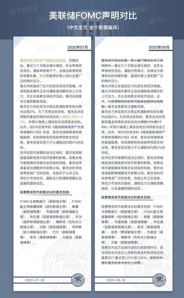 1美联储将基准利率上调75个基点至2.25%-2.50%区间,符合市场预期。 2美联储已经在过去两个月中两次加息75个基点,这是美联储年内第4次加息。 3资产负债表的缩减将按计划在9月份加速,抵押贷款支持证券(MBS)的每月缩减上限将增至350亿美元,公债的每月缩减上限将增至600亿美元。 4美联储重申对通胀风险“高度关注”,联邦公开市场委员会“下定决心”将通胀率恢复到2%的目标,持续加息可能是合适的。 5就业增长强劲,失业率保持低位,但最近的支出和生产指标已经走软。 鲍威尔发布会要点: 1是否再次实施超常规的加息取决于经济数据,必要时会毫不犹豫地采取更大幅度的行动。 2随着利率变得更具限制性,在某个时候放慢加息步伐可能会是适当的。 3不会像以前那样提供明确的利率政策指引,不会对9月会议提供具体指引。 4不认为美国经济目前处于衰退,委员会认为经济增长放缓是必要的,需要一段低于潜在增长率的时期来创造一些闲置。 5最近的加息幅度很大,而且来得很快,全部的影响还没有感觉到。 6虽然一些商品的价格有所缓解,但通货膨胀仍有额外的上升压力。 7希望在今年年底达到适度的限制性水平,即3%-3.5%。 财联社7月28日讯(编辑 史正丞)北京时间周四凌晨2点,美联储联邦公开市场委员会如期发布最新的利率决议。与市场预期一致,本次会议继续加息75个基点,将联邦基金利率区间上调至2.25%-2.50%,并将延续此前既定的缩表进程。 根据今年5月定下的方案,美联储从6月1日开始最初每月最多缩减300亿美元的美债,和175亿美元的机构抵押支持证券(MBS)。从9月开始,这两项资产的每月缩表上限将翻倍至600亿美元和350亿美元。 由于7月决议大致延续既定的政策步伐,所以在措辞上与6月决议的差别并不大。只有在开头的经济状况描述中,美联储将6月的“整体经济活动似乎较一季度下行后反弹”改成了“近期指标显示支出和生产都出现疲软”。此外,美联储依然将俄乌冲突视作通胀和全球经济走向的额外压力。 美联储继续强烈承诺将通胀拉回2%的政策目标。在六月决议中唯一投下反对票的堪萨斯城联储主席乔治(Esther George)也在今天投出赞成票,所以这份决议获得所有票委的赞同。连续四次FOMC会议加息后,美联储在短短五个月的时间里已经走完等同2015-2018年加息的步骤。然而在美国通胀始终处于四十年高位的背景下,美联储势必将在接下来的会议中继续加息,只不过节奏可能会稍稍放缓一些。 ![]()