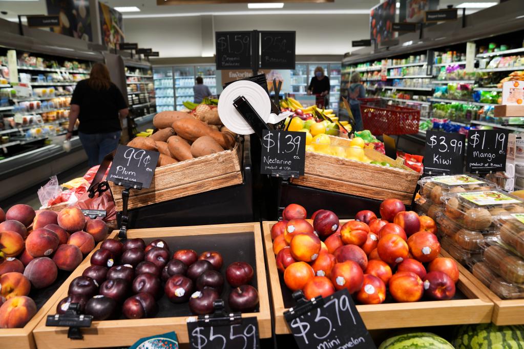 这是7月13日在美国俄勒冈州尤金一家超市拍摄的水果货架。(新华社记者王迎 摄)