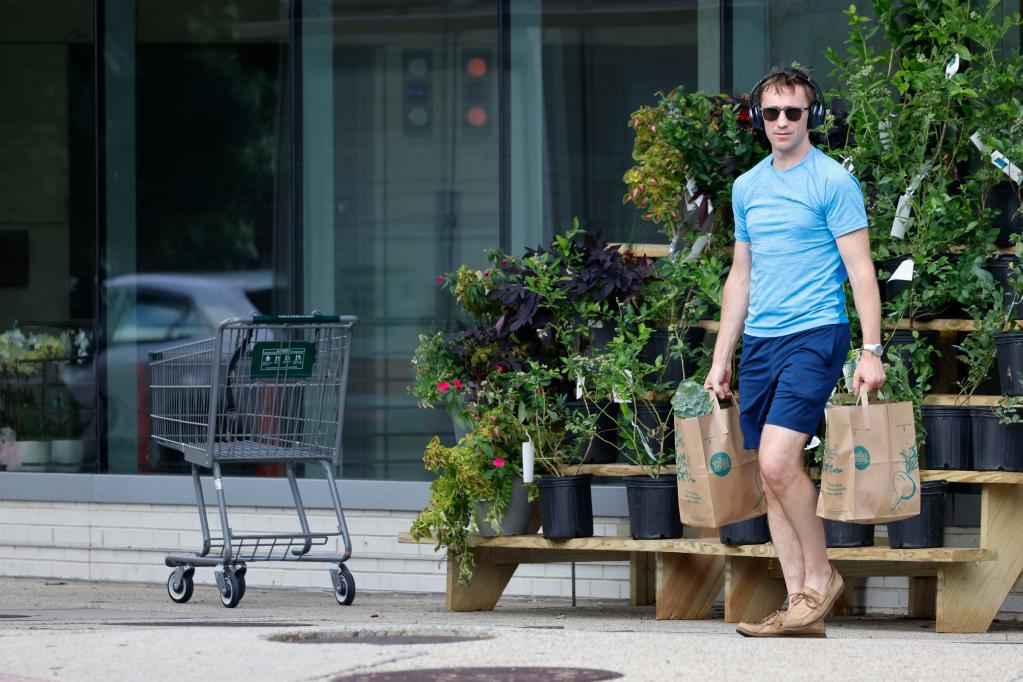6月14日,在美国华盛顿,一名男子提着购物袋从一家食品超市旁走过。(新华社发,沈霆摄)