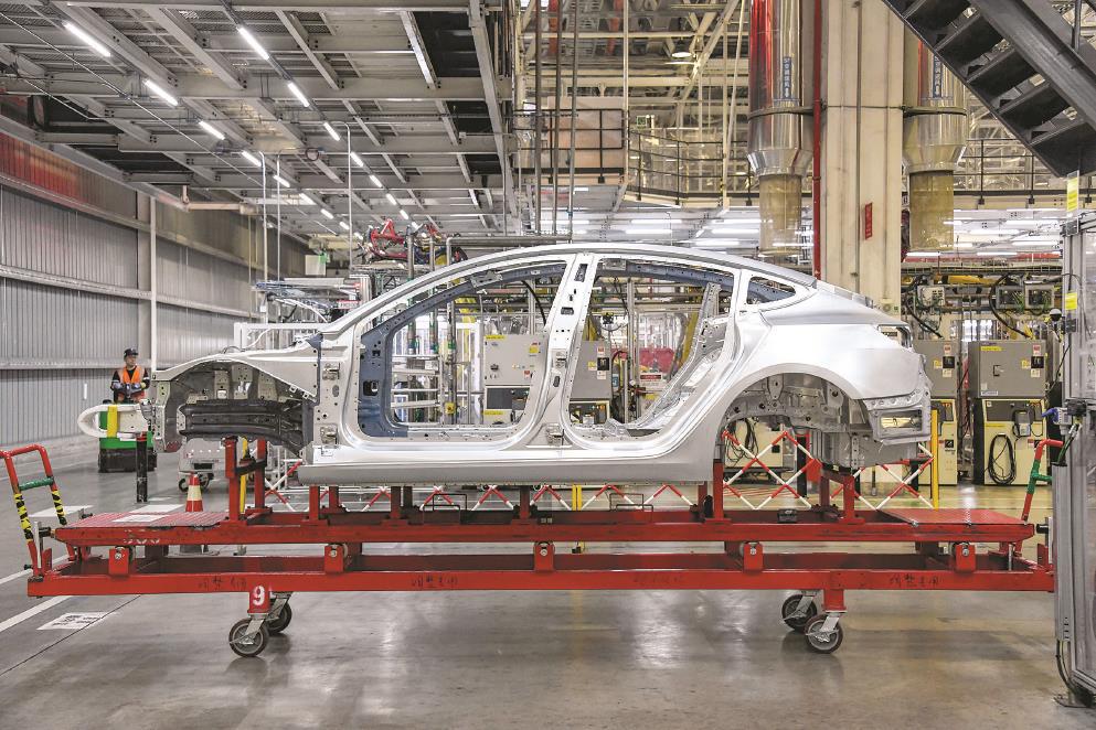 特斯拉上海超级工厂的产业链本土化率超过95%。图为该工厂生产线。 记者 邢千里摄