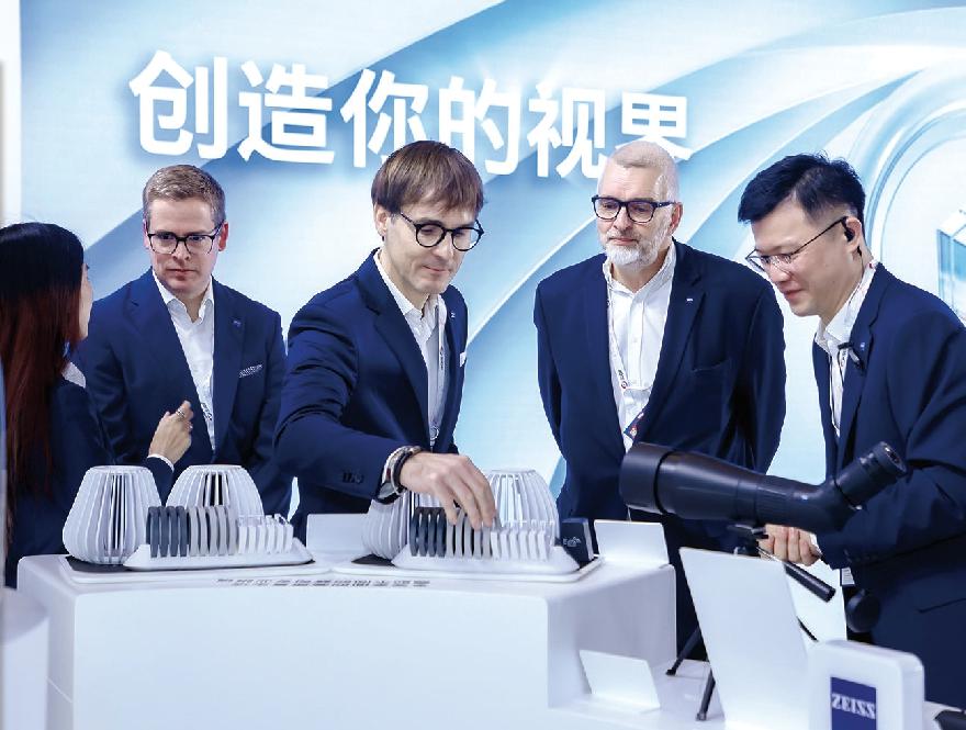 蔡司消费光学事业部首席执行官斯文·赫尔曼(右三)等在上海的展会上察看新品。 (均受访者供图)制图:张继