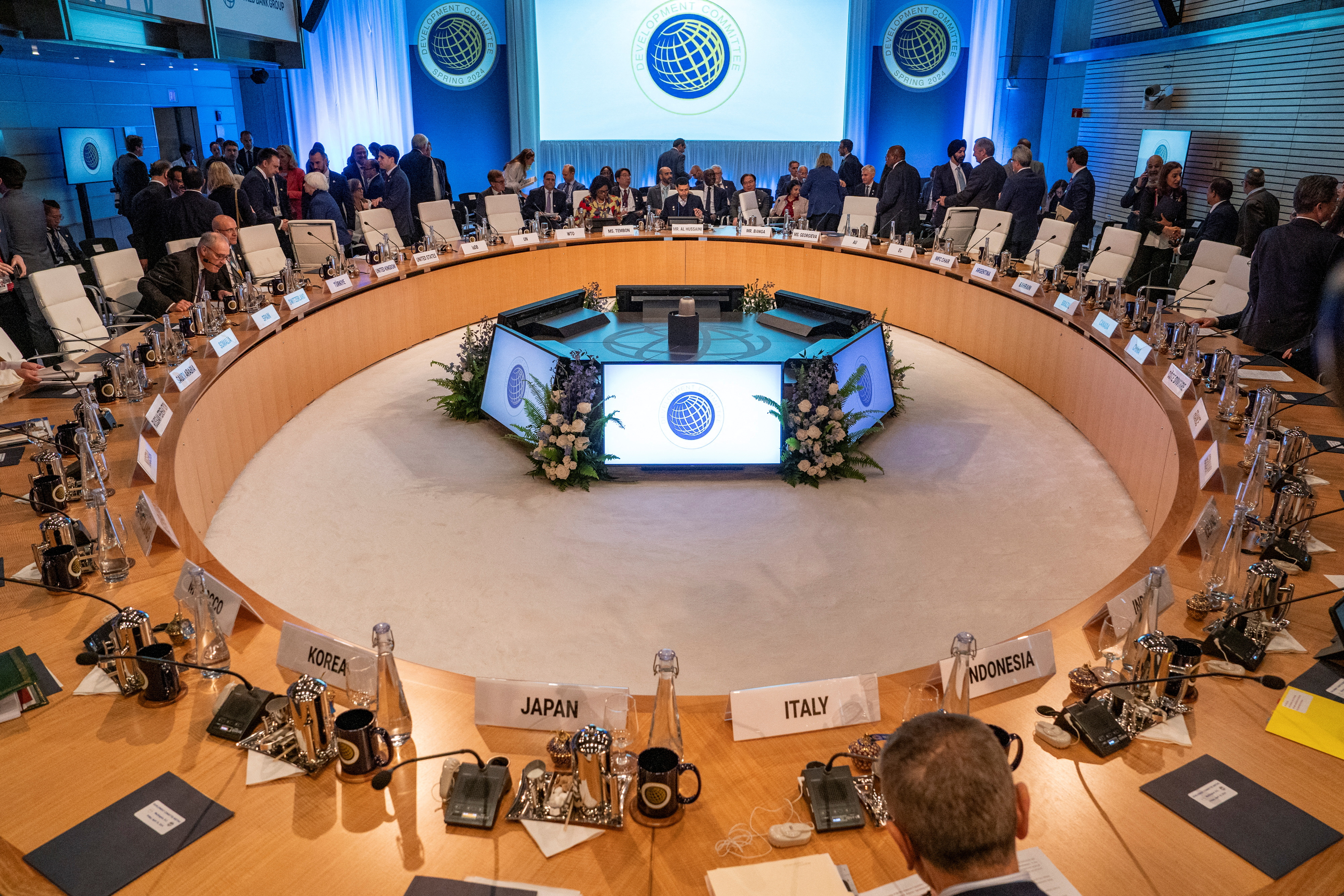 4月19日,各国代表抵达美国华盛顿世界银行总部参加世行/IMF春季会议期间的发展委员会会议。(路透社)