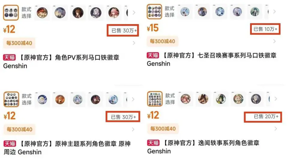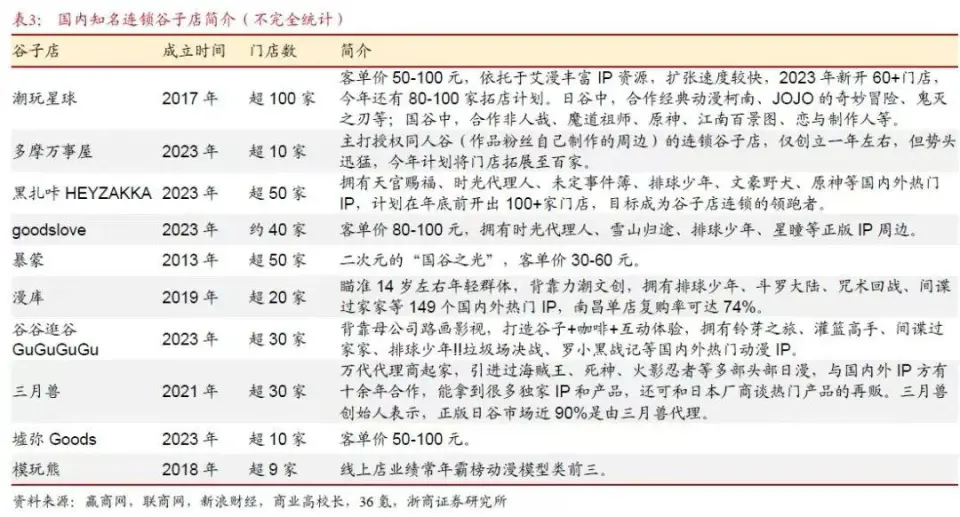 在李羽看来,尽管乌萨奇存在于二次元世界,但只要买了相关的周边,它就像真的走到了现实世界,成为了自己的亲人,陪着自己。 为了更多地收集乌萨奇的周边,李羽在线下的谷子店和线上网店都购买过,价格在40—60元不等。 每次买到新的周边,李羽都会很开心。买回家摆出来后,也会让她有一种满足感。这些周边还能帮助李羽找到志同道合的朋友,成为社交时的话题。 在年轻人中间,还有国产游戏《第五人格》《光与夜之恋》《原神》,经典动漫《海贼王》《名侦探柯南》《灌篮高手》《蜡笔小新》《机器猫》,这些作品的人气都非常高,某些角色的周边也很热销。 不难发现,在热衷于周边的年轻人眼中,精神寄托和情绪价值非常重要。他们被虚拟人物的品格或故事吸引,并渴望从这些人物身上得到力量,与现实连接。 除了谷子本身具备的特性,供给端的兴旺也不断勾起年轻消费者的购买需求。 早在十多年前,二次元市场也有许多的周边商品,类似贴纸、钥匙扣等小商品,也曾经在80后和90后中流行,但工艺没有如今精美。更重要的是,这些小商品的经营缺乏一个重要的基础——IP。 IP是整个产业链中最重要的一环,是谷子的核心卖点和需求来源。在二次元的世界里,动漫、游戏、小说等IP广泛繁杂,覆盖了大量受众。 近几年,伴随着二次元市场不断发展,整个产业链不同环节的公司纷纷下场,从IP版权方、IP代理和运营商……整个市场都显得异常热闹和活跃。 就拿国内一些连锁谷子店品牌来说,他们背靠影视动漫和IP代理公司,在很短的时间内就能上新产品,还能对IP的商业价值进行深度开发,并在运营模式上衍生出更多玩法。 ![]() 比如举办粉丝节,开展快闪活动、开设主题咖啡厅、推出限定产品等,以此来增强消费者粘性。 其实,年轻人对于二次元产品的需求一直存在,谷子店恰恰是新时代下,因需求而生的新的零售业态。 三、 年轻人买爆的周边,撑起一桩千亿生意 短短七年,我国二次元周边衍生产业规模从50多亿,到如今突破1000亿。 在这个产业链上,最核心的上游环节便是IP,也就是版权方,它们可以通过创作和运营IP,或通过代理IP来进行运营。 例如米哈游,它是一家国内知名的游戏公司,旗下游戏《原神》在天猫旗舰店就有多个爆款周边产品,销量在10万甚至30万以上。 ![]()