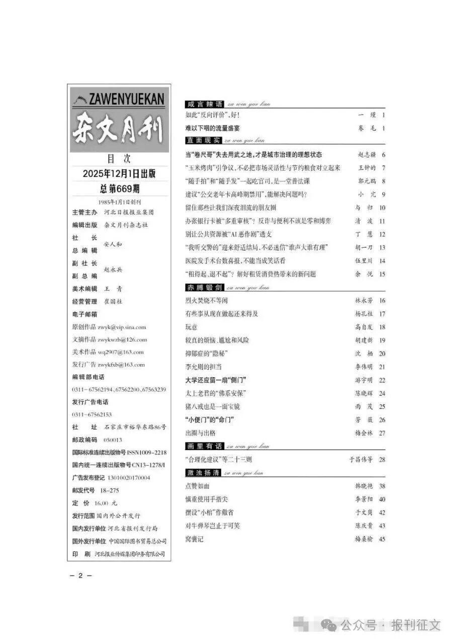 ![]() ![]() 杂文是南朝刘勰在《文心雕龙》中提出的文艺性论文体裁,泛指传统诗文之外的多样化文体,以短小犀利、论辩与形象结合为核心特征,常运用幽默讽刺反映社会现实。 杂文实际上也是散文的一种,有关社会生活、文化动态以及政治事变的杂感、杂谈、杂论、随笔,都可归入这一类。在近代中国文学史,大家最熟悉的杂文家莫过于鲁迅。鲁迅的杂文是中国社会的、时代的、历史的一面镜子,开创现代杂文新风。 不管杂文报刊存在与否, 杂文或许都不会变。 下一个告别的, 会是谁? 来看看最后一期《杂文月刊》的目录吧—— ![]() (晓歌编辑) |