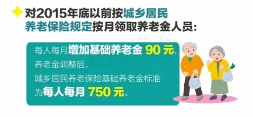 对2015年底以前按城乡居民养老保险规定按月领取养老金人员,每人每月增加基础养老金90元,养老金调整后,城乡居民养老保险基础养老金标准为每人每月750元。