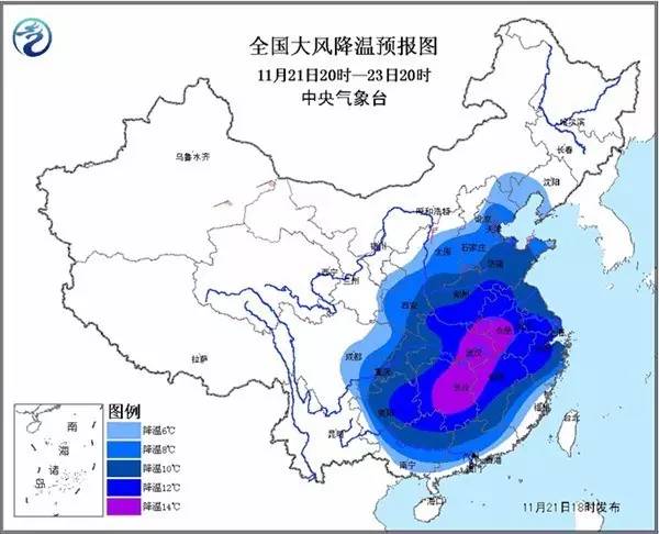预计,受寒潮影响,21日夜间至24日,我国中东部大部地区将自北向南先后出现大范围大风降温天气,平均气温将普遍下降6~10℃。 其中,陕西南部、黄淮中西部、江淮中西部、江汉、江南中西部、华南北部以及四川东北部、重庆东部、贵州中东部等地气温将下降12~14℃,河南南部、安徽西部、湖北中东部、湖南大部、广西东北部等地的部分地区降温可达16℃以上。 上述地区伴有4~6级偏北风,东部和南部海区风力有7~8级,阵风9~10级。 这次寒潮到底有多“冻人”? 从气象部门的动作来看,此次的寒潮确实不容小觑。那么具体有多凶猛呢? 除了局地降温将超16℃,多地气温将创入冬以来新低。此次寒潮天气将致使我国多地出现今年入冬以来最低气温,部分地区还可能破历史记录。其中24日凌晨,华北平原北部最低气温将达到-10℃左右,最低温度0℃线将位于江南北部,江南南部和华南北部最低气温将达到4~8℃!届时,近日还在秀短袖的南方小伙伴们也该秋裤(甚至毛裤、棉裤)上身了!