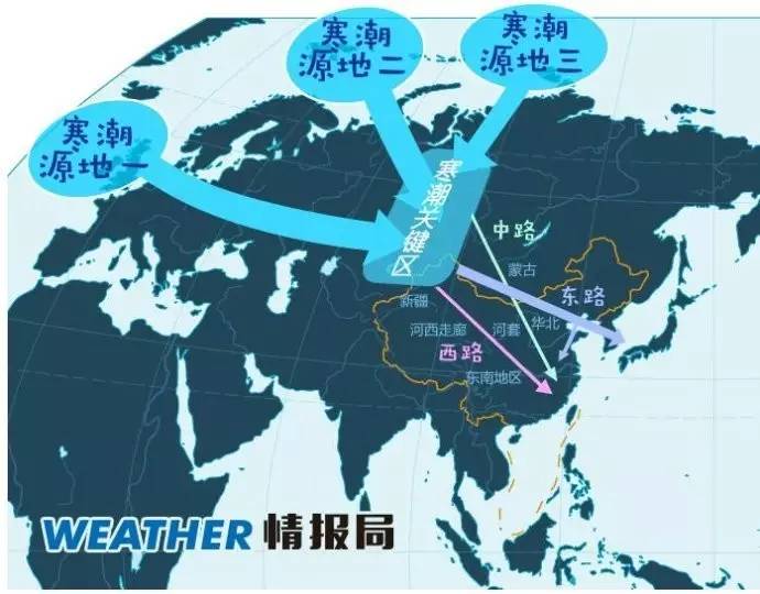 这个答案说对也对,但不够准确。简单来说,寒潮不远万里来到中国,通常要经过三个“老窝”、一个“加油站”、四条“寻常路”。 三个“老窝” 其实是冷空气的三个主要发源地:一是冰岛以南洋面上,二是新地岛以西洋面上,三是新地岛以东洋面上。 这三个源地都在高纬度,常年受太阳光的斜射或很少见到太阳光,地面接收太阳光的热量较少,温度很低,如冬季北冰洋地区气温经常在-20℃以下,最低时可达-60~-70℃,1 月的平均气温常在-40℃以下,可以说是冷空气良好的“生产基地”。 一个“加油站” 在这三个冷空气源地中,95%的冷空气都要经过西伯利亚中部地区,并在那里积累加强,可以说是冷空气南下的重要“加油站”,那里也因此被称为“寒潮关键区”。 所以西伯利亚的寒冷也可想而知,冬季寒冷漫长,大部分都在-20~-45℃,年均气温低于0℃。就在此次寒潮到达我国的前三天,西伯利亚的很多地方已经降到了-40℃以下。 四条“寻常路” 经过西伯利亚的“中转”后,来到我国主要有四条路可以走: