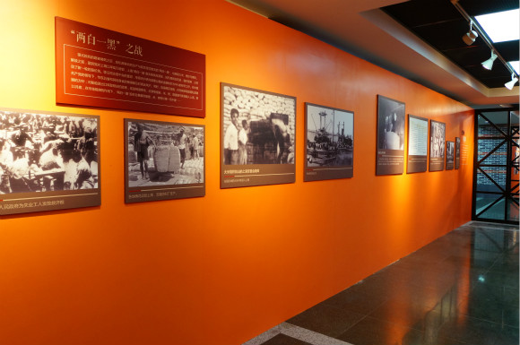 “两白一黑”之战的故事 “见面礼”、“血战月浦”、“险渡苏州河”、“吃’战斗饭’”等历史小故事,真实讲述了人民解放军艰苦朴素的作风、在硝烟弥漫的战场上的牺牲精神,让观众了解历史的细节,感悟英雄精神。 在解放上海战役中,外围最激烈的战斗发生在月浦一带。展板“血沃月浦”中讲述了这样的故事:担任主攻月浦的部队是29军87师260团,5月13日凌晨2时,260团到达月浦镇北极节点,黎明时向敌人发起冲击。到了14日中午时,29军军长胡炳云把电话打到了260团指挥所,副团长梅永熙接起电话:“报告军长,敌人已经后退。”胡炳云:“伤亡如何?” 梅永熙:“……全团可以参加战斗的,只剩下120人。”胡炳云:“那你们团还能打主攻吗?”梅永熙:“军长,我们还能打……我们无论如何也要撞开月浦大门。” 当晚,260团将所能参加战斗的120人编成两拨,开始了新一轮的攻击。最终,他们进占了月浦的部分街区,为之付出了伤亡1200人的沉重代价,攻入月浦时只有64人。