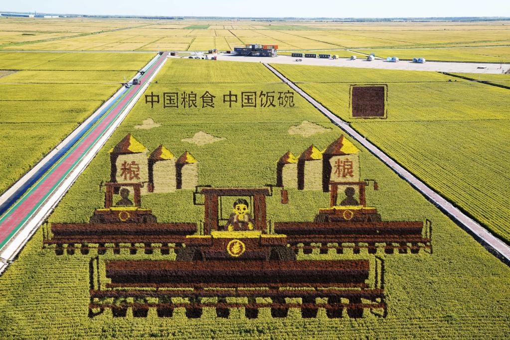 9月2日,黑龙江省富锦市万亩水稻科技示范园,多种颜色组成的巨型稻田画勾勒出金秋壮美景象。新华社记者 王建威 摄