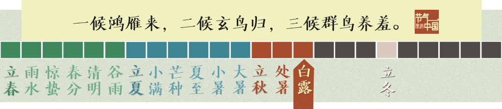 白露,名字很美,时节更美。时至九月,暑气渐消,秋日的舒爽让人心旷神怡,金色的阳光给大地点染上更加丰富的色彩。各地陆续进入秋粮收获时间,广袤的田野承载着丰收的希望,将用这一年的好收成来回馈人们的辛劳付出。 ![]() 秋意浓 白露,是二十四节气中的第十五个节气。我国古代将白露分为三候,分别是鸿雁来、玄鸟归、群鸟养羞,这意味着燕子等候鸟准备开始迁徙,要飞往南方温暖的地方过冬,留鸟纷纷开始储备越冬的食物。 “白露秋分夜,一夜冷一夜”。白露正是天气由热转凉的转折点,我国北方大部地区开启夏秋的转换,秋天的版图自北向南不断拓展。 白露时节,秋风渐起、秋意渐浓。北方冷空气活动更加频繁,北京、河北等地这几日已经是秋高气爽的感觉了。白天温度虽然可达30摄氏度以上,可是夜晚会下降到20摄氏度左右甚至更低,是一年里昼夜温差最大的节气。 在南方,特别是江南、华南地区,告别了前段时间的极端高温天气,近期的天气让人感觉舒服了一些。但有的地方暑热尚未完全消退,“秋老虎”仍有几分余威。中央气象台预报显示,未来几天,江西等地的气象干旱将持续或发展。 ![]()