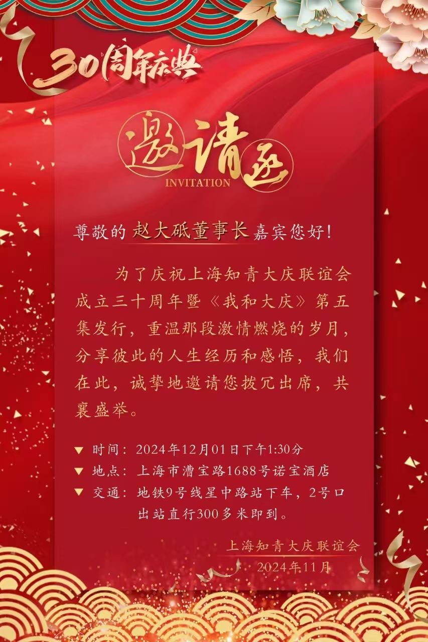 老辰光网简讯:(蔡荣华报道)上海知青大庆联谊会成立三十周年暨《我和大庆》第五集发行大会,2024年12月1日,在上海诺宝中心隆重举行。