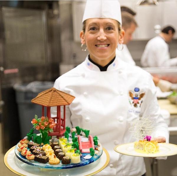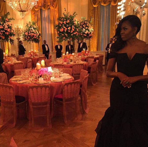 米歇尔·奥巴马在Instagram上传了白宫工作人员正在为国宴做准备的照片。 根据米歇尔之前公布的菜单,为习主席举行的国宴菜单上有一道汤、两道主菜和一道甜点,各配一种酒。汤是野蘑菇黑松露汤,佐以绍兴黄酒;第一道主菜是黄油焗缅因龙虾配春卷,佐以俄勒冈州彭娜-阿什酒庄2014年的维欧尼干白;第二道主菜是烤科罗拉多羊里脊配蒜蓉脆皮鲜奶和花椰菜苗,佐以普莱德山酒庄2012年梅洛干红;甜点则是罂粟籽面包黄油布丁配中国柠檬凝乳和荔枝沙冰,佐以世酿伯格半干型起泡酒。
