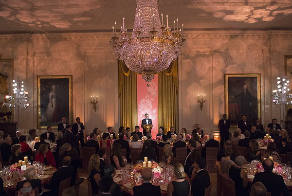 奥巴马向习近平夫妇敬酒。 近几年来,美国国宴很多蔬菜食材都来自于第一夫人米歇尔的菜园,这次登场的南瓜食材就是其中一例。曾任小布什社交秘书的利·伯曼此前对媒体表示,白宫的国宴虽然模式上都差不多,但每次都会有不同细节的呈现,接待不同的领导人就会有不同的风格。 根据资料显示,奥巴马的两届任期里共举行了7次国宴,曾招待过印度时任总理辛格(2009年)、墨西哥时任总理卡尔德龙(2010年)、中国时任国家主席胡锦涛(2011年)、德国总理默克尔(2011年)、韩国时任总统李明博(2011年)、英国首相卡梅伦(2012年)以及法国总统奥朗德(2014年)。