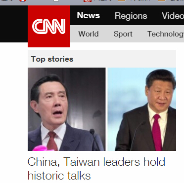 CNN内页截图 美国有线电视新闻网CNN头条:中国大陆和台湾举行历史性会谈。在内页注明两岸同属一个中国。