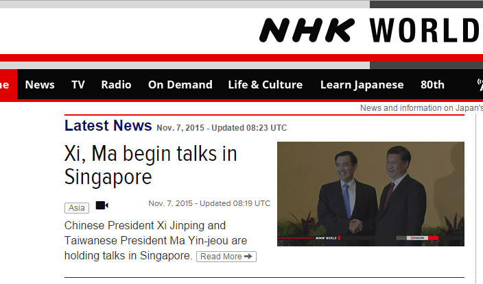 日本放送协会NHK英文网首页截图 日本放送协会NHK英文网头条:习和马在新加坡会谈