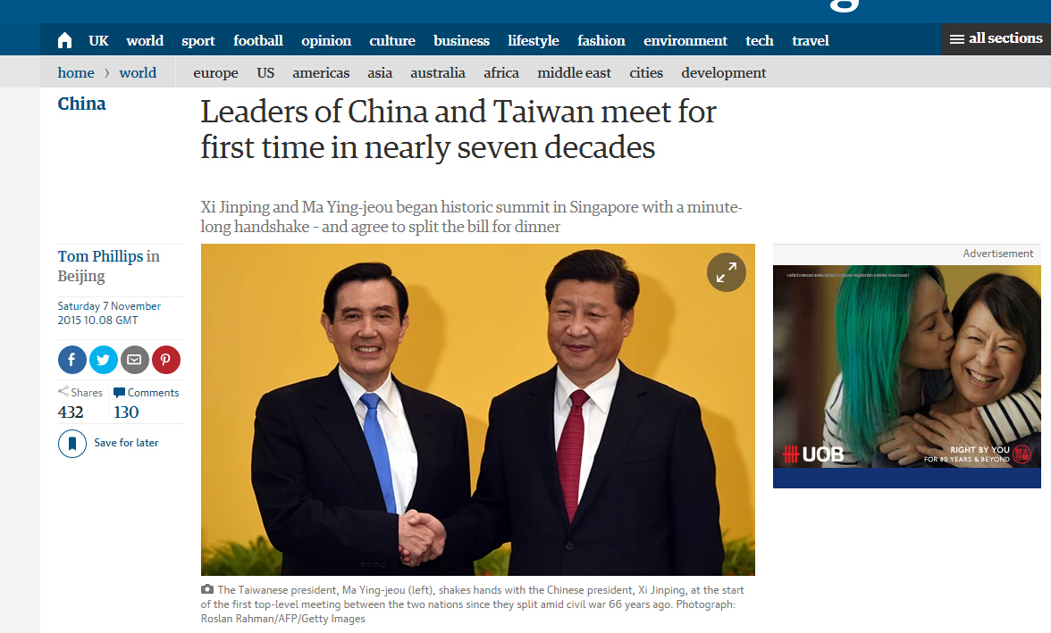 《卫报》截图 英国《卫报》:中国大陆和台湾领导人近70年来首次会面