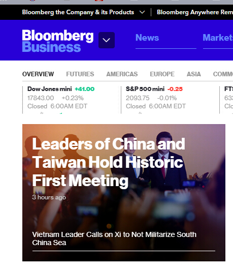 彭博社首页截图 美国彭博社头条:中国大陆和台湾的领导人举行历史性会面