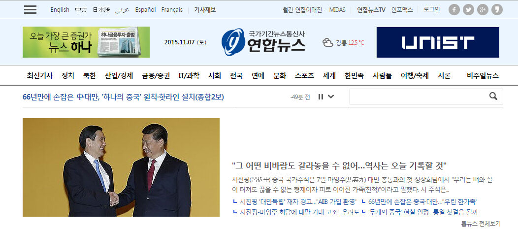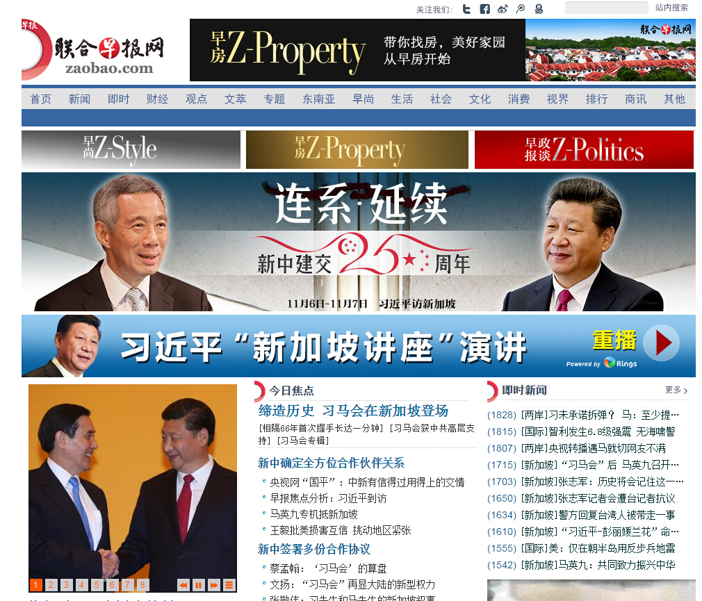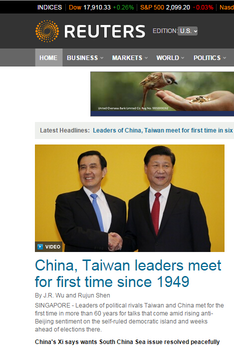 英国路透社首页截图 英国路透社头条:中国大陆和台湾领导人1949年来首次会面