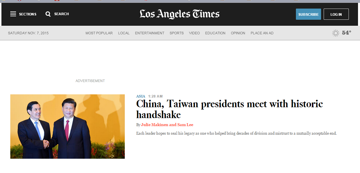 洛杉矶时报首页截图 美国《洛杉矶时报》头条:中国大陆和台湾的领导人历史性握手。