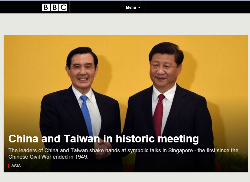 BBC首页截图 英国广播公司BBC头条:中国大陆和台湾举行了历史性会面