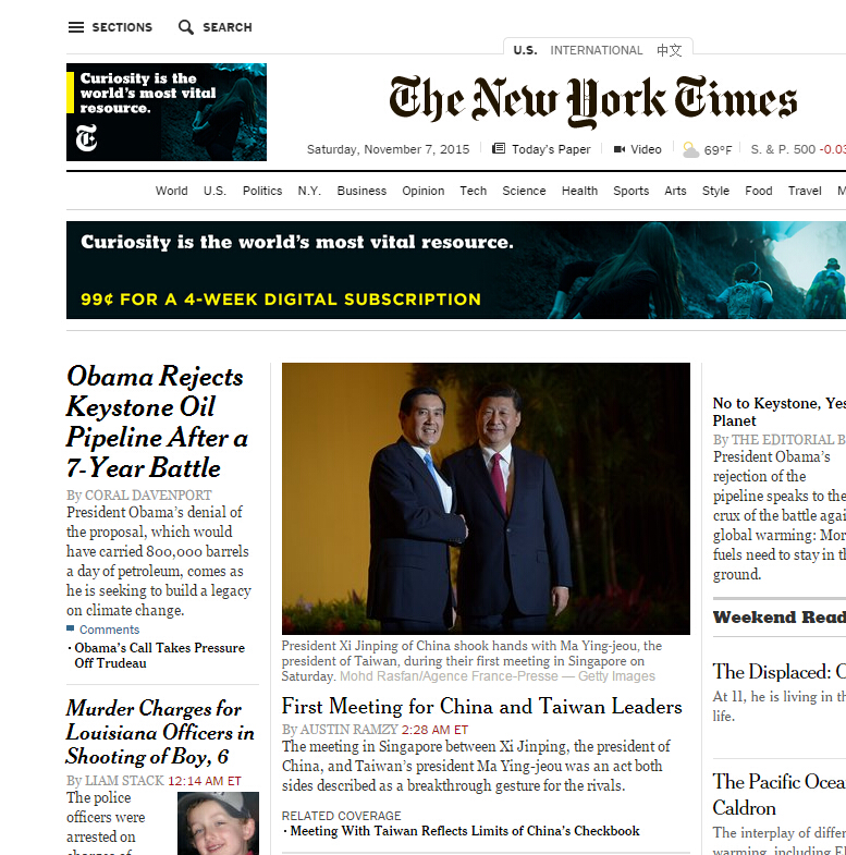 纽约时报首页截图 美国《纽约时报》头条:中国大陆和台湾的领袖首次会面