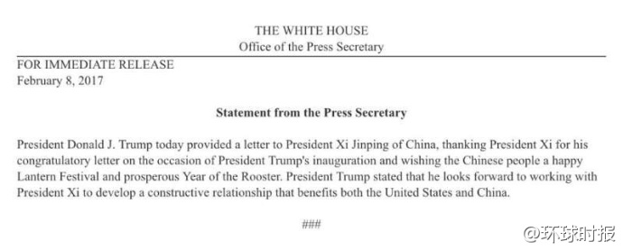 白宫消息截图 据美国白宫消息,美国总统特朗普8日致信中国国家主席习 jìn píng ,祝中国人民元宵节快乐,并表示希望与中方发展惠及两国的建设性中美关系。 来源:环球网 编辑:北风 (责任编辑:北风) |