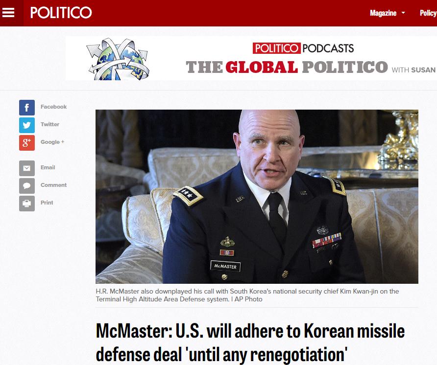 日前,美韩两国就“萨德”费用互呛,特朗普称韩国应向美国支付10亿美元的“萨德”反导系统部署费用,韩国防部则随后“拒绝”。之后,韩国国家安保室长金宽镇30日称,在与美国国家安全事务助理麦克马斯特的通话中,双方再次确认““萨德””费用协议内容。但是,麦克马斯特之后在30日(当地时间)在接受美国福克斯《Fox News Sunday》采访时暗示美国打算围绕“萨德”费用问题进行重新谈判。韩国国防部随后在5月1日再次强硬表态, 坚称“萨德”费用无法再协商。 美国家安全顾问有意重新协商“萨德”费用否认韩方报道 韩联社4月30日曾报道称,韩国国家安保室长金宽镇称,韩美双方就美国总统特朗普的“萨德”费用发言争议和现存的两国协议内容进行再确认。 根据两国协议,韩国政府提供地皮及基础设施等,“萨德”的建立、运营及维护费用则由美方承担。 但是,据美国媒体福克斯新闻30日在其节目《Fox News Sunday》中的报道称,麦克马斯特当天在采访中就“您曾表示将坚守现有协定,向韩方提供10亿美元,请问这是事实吗”的问题表示,“我最讨厌的就是否定总统的发言。这并非我意(that’s not what it was)”。接着他补充说道,“我所说的内容是,‘在重新协商之前,现有协定都有效,我们将坚守我们的发言’”。 麦克马斯特对“您的意思是,对于由谁来负担‘萨德’部署费用还尚未做出决定吗?”的后续问题并未直接作答。他回答称,“重点是关于‘萨德’和我们提供的(同盟)防卫,就像我们对待其他同盟国一样,都会重新进行协商”。 韩国《中央日报》5月1日对此分析称,这与青瓦台发表的内容不同,预计会产生争议。《中央日报》5月1日发表了题为“美国首先应就萨德费用问题统一内部意见”的评论文章,称美国必须尽快理清目前的混乱局面。两国应由部长级官员出面澄清相关情况,只有这样,才能在朝鲜即将开发出可以搭载核弹头的洲际弹道导弹(ICBM)的危急情况下切实做好防备。 韩国防部再强硬表态:坚称“萨德”费用无法再协商 尽管韩美通话表态内容不一致引发风波,韩国方面仍然坚持其此前立场。5月1日,韩国青瓦台及国防部接连对此表态。韩联社5月1日报道称,韩青瓦台称美方重申韩美“萨德”现有协议仍有效。 中央日报》5月1日报道称,青瓦台国家安保室室长金宽镇当日向各新闻社常驻青瓦台采访记者发送了短信,内容为“前一天已向大家告知了与美国国家安全顾问赫伯特·麦克马斯特的通话内容,目前没有需要补充的事项。我们认为麦克马斯特顾问在接受美国媒体采访时提及的内容再次重申了韩美此前达成的协议仍有效”。