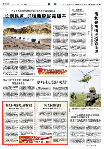 人民军队的历史,就是听党指挥、永葆初心的历史,就是浴血奋战、牺牲奉献的历史,就是改革创新、勇争第一的历史。为纪念建军90周年,解放军报与新华社军分社联合开设“波澜壮阔90年·难忘的90个第一”专栏,组织力量深入一线部队,采访权威专家,从人民军队90年波澜壮阔的历史中撷取90个“第一”。请关注今日《解放军报》的报道——