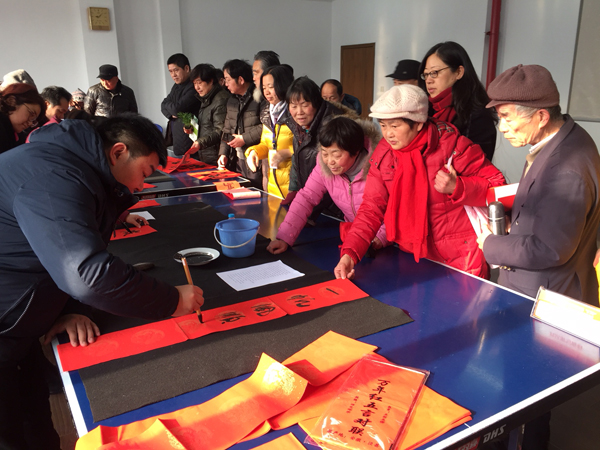 书法家在枫泾镇社区文化活动中心内为当地农民群众写春联。